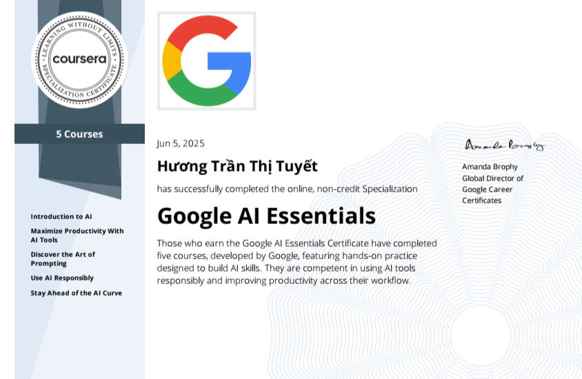 - Giúp hàng trăm học viên thi đậu Google AI Essentials & hoàn thiện portfolio